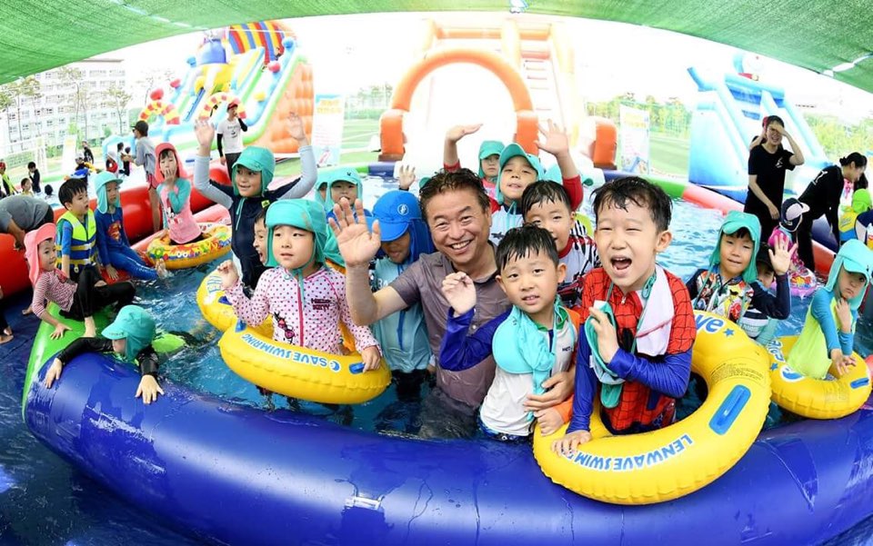 청사 야외 다목적구장(축구장)내에 설치 된 물놀이장은 튜브에 공기를 넣은 바닥풀장과 워터슬라이드를 연령대별로 이용할 수 있도록 설치했다.