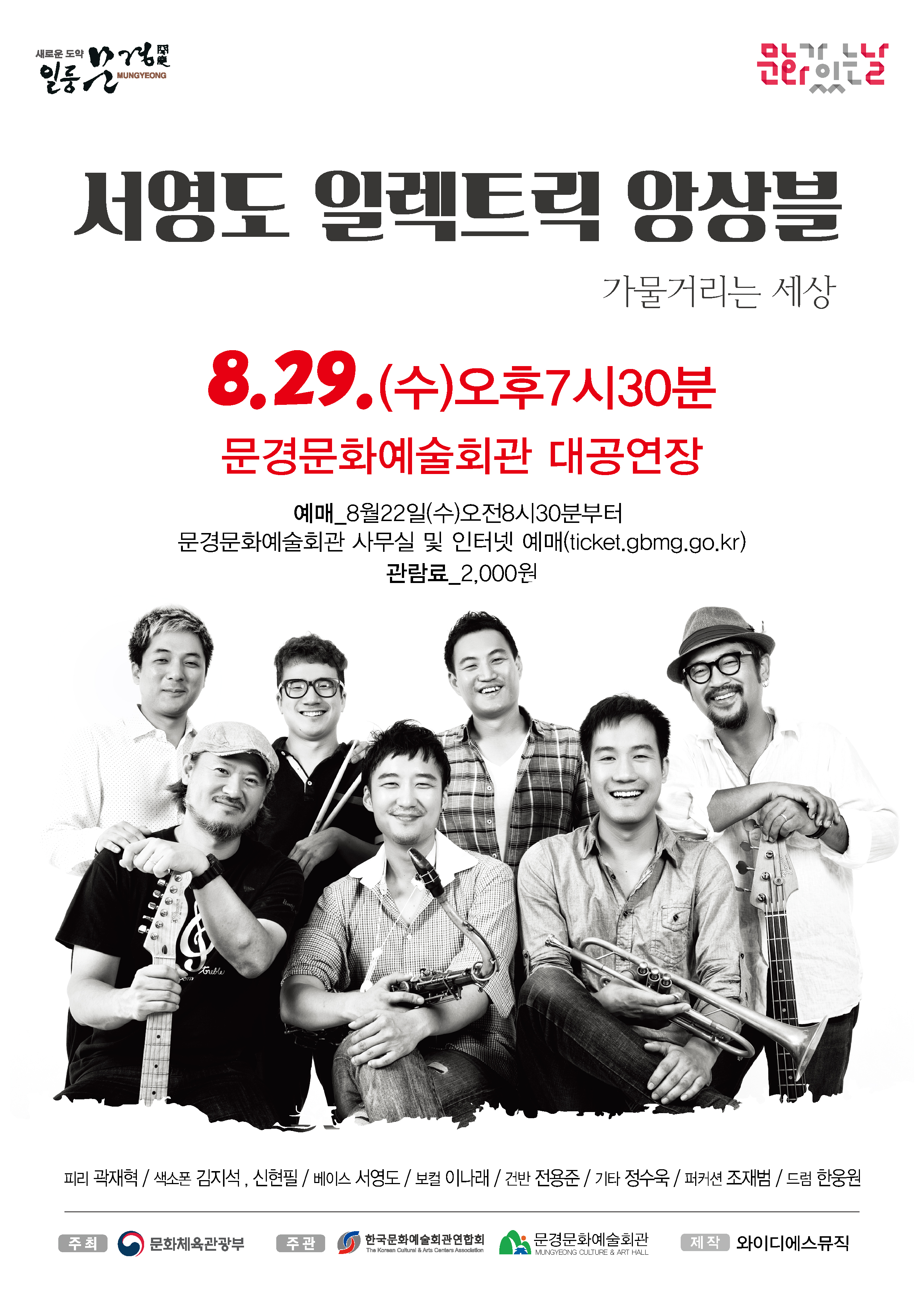 8월 문화가 있는 날(매월 마지막 주 수요일)을 맞이하여 베이스 연주자 서영도가 이끄는 서영도 일렉트릭앙상블의 ‘가물거리는 세상’ 콘서트가 오는 29일 저녁 7시30분 문경문화예술회관 대공연장에서 열린다.
