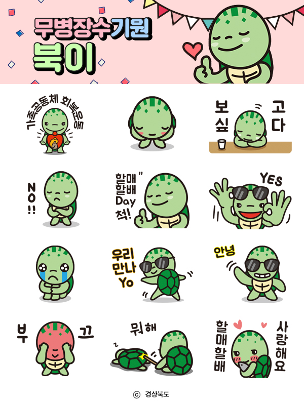 ‘할매할배의 날’ 이모티콘은 무병장수의 상징 거북이를 활용하여 제작하였으며, 가족공동체 회복운동인 할매할배의 날을 알리는 메시지 ‘엄지척’과 가족이 함께 만나자는 메시지와 ‘보고싶다', ‘뭐해' 등 귀엽고 유쾌한 공감대를 형성할 수 있는 12종으로 구성되어 있다.