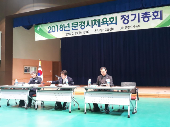| ↑↑ 문경시체육회 고윤환(문경시장) 회장(가운데)이 지난 2월 온누리스포츠센터에서 열린 2018년 문경시체육회 정기총회를 주재하고 있다. |