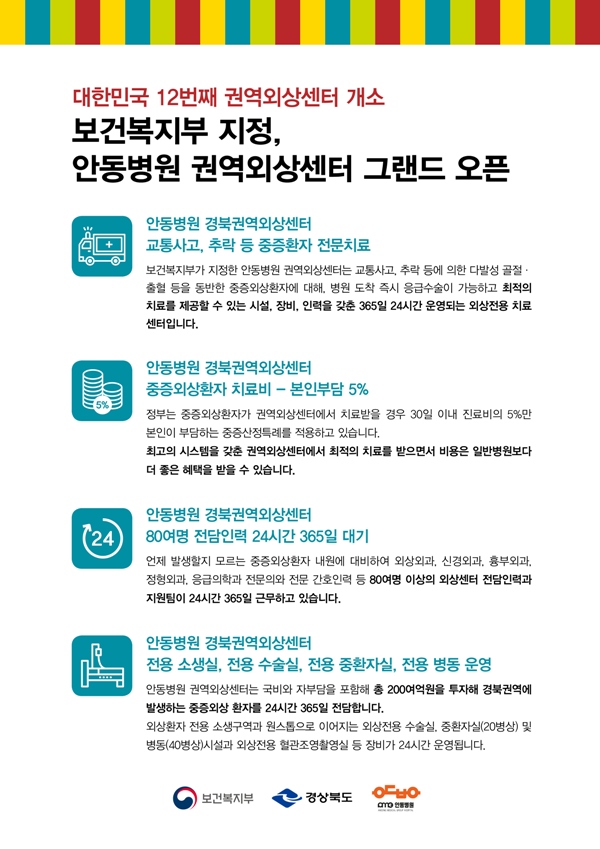 한편 보건복지부는 2012년부터 전국에 총 17개 권역외상센터를 선정했으며, 안동병원의 권역외상센터가 개소하면서 총 12개 외상센터가 공식적으로 운영되고 있다.