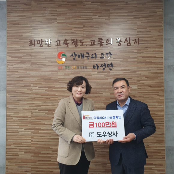(주)도우상사 박성진 대표는 12월 26일 마성면 행정복지센터를 방문하여 불우이웃돕기 성금 100만원을 기탁했다.
