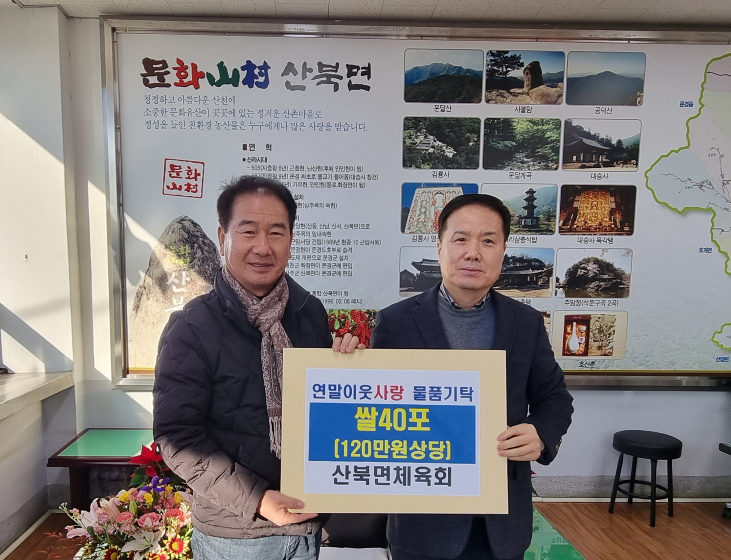 황혁주 산북면 체육회장은 “한 해를 마무리하는 날 각 단체가 한마음이 되어 어려운 이웃에게 나눔을 실천할 수 있어 기쁘다.”라며 “축하의 의미로 받은 쌀이 겨울철 취약 계층에게 따뜻한 힘이 되었으면 좋겠다.”라고 밝혔다.