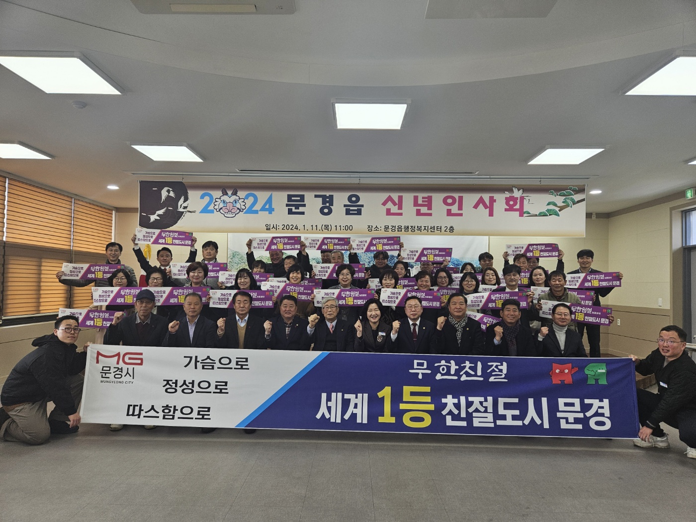 이번 신년 인사회에서는 1월 8일 자로 문경읍에 취임한 유미숙 문경읍장과 기관단체장, 주민자치위원, 직원 등 70여 명이 참석하여 신년사를 시작으로 2024년 주요 시정 안내, 친절 도시 문경 만들기 퍼포먼스를 펼쳤다.