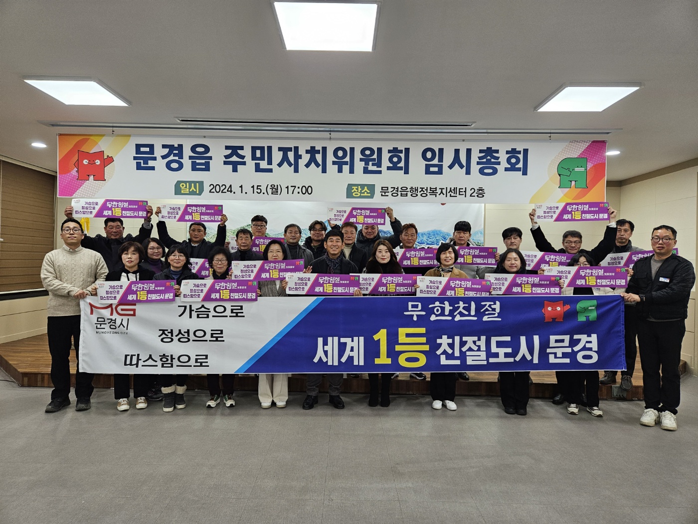 이번 주민자치위원회 임시총회는 제3기 주민자치위원회 임원 선출 및 임명의 건 등으로 진행되었으며 이후 친절도시 문경 만들기 퍼포먼스도 실시하였다.