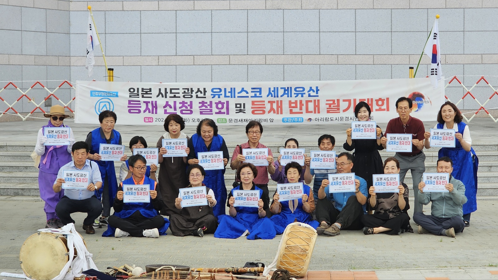 『 우리 ‘아리랑도시문경시민위원회’는일본 ‘사도광산' 유네스코 세계유산 등재를반대한다! 』 ‘사도광산’은 제2차 세계대전 중 많은 한국인이 강제노역을 당했던 곳으로, 일본 정부에서 ‘유네스코 세계유산 등재’를 추진하였다.그러나 유네스코 자문기구인 ‘이코모스(ICOMOS-국제기념물유적협의회)’가 일본이 2023년 1월 니가타현의 사도광산을 세계유산으로 등재 신청한 것에 대해 지난 6월 6일에 ‘보류’를 권고하고 추가 자료를 요구했다.보류 사유는 핵심 항목 세 가지와 여덟 가지 추가 사항으로 구성되어 있는데, 그 핵심은 1989년 폐광이 된 사도광산의 광업채굴이 이뤄졌던 모든 시기를 등재 신청서에 포함하라는 것이다.여기에는 ‘조선인 강제노역이라는 문제가 있다.’ 다시 말해 일제강점기 때인 1939년 이후 약 1,500명의 조선인이 사도광산에 강제 동원되어 가혹한 노역에 시달린 사실이 구체적인 자료와 증언으로 입증된 상태다. 일본은 이렇게 어두운 역사인 강제 동원이 이뤄졌던 시기를 피하고 숨기기 위해 등재 대상 기간을 에도시대(1603~1867)로 한정했다.그리고 일본은 2015년 지옥의 섬이라는 ‘군함도(하시마·端島) ’등 ‘메이지일본 산업혁명유산 23곳’의 세계유산 등재 시 조선인 강제노역을 인정하고 전체 역사를 이해할 수 있는 시설을 만들겠다고 약속했지만, 이를 지키지 않고 기만한 일본이라는 나라를 믿을 수 없고 또다시 그런 전철을 밟을 수는 없다.반인륜적인 일본의 산업시설 사도광산이 2012년 ‘유네스코 인류무형문화유산’으로 등재된 아리랑과 나란히 세계유산으로 등재되는 것은 모욕적이다. 결코, 함께 할 수 없다는 것을 천명하는 것이다.사도광산 세계유산 등재 여부는 2024년 7월 21~31일 인도 뉴델리에서 개최되는 유네스코 세계유산위원회(21개국 정부로 구성)에서 최종 결정된다.이렇듯 등재 여부가 결정되는 시기가 임박한 시기에 처하여‘근대 아리랑의 시원지 문경’에서 2012. 12. 5. ‘유네스코 인류무형문화유산’ 등재 시 주요 아리랑 목록에 들어간 ‘문경새재아리랑’을 보급 전승하기 위해 결성된 ‘아리랑도시문경시민위원회’는 이런 행위에 분노하며일본에 의해 사할린 등에 강제로 끌려와서 다시 일본 탄광으로 이중 징용을 당하면서 혹독한 시련 속에 디아스포라의 아픔을 달래기 위해 아리랑을 목 놓아 부르면서 향수를 달래다 생을 마친 고혼들을 달래주기 위해서라도 역사를 숨기고 왜곡하는 일본의 사도광산 세계유산은 기필코 막아야 한다. 저항·대동·상생이란 아리랑 정신을 실현하기 위해‘아리랑도시문경시민위원회’ 42명 위원우리는 요구한다. ◇ 일본은 스스로 사도광산 세계유산 등재 신청을 철회하라!◇ 대한민국 정부는 일본의 사도광산 세계유산 등재 신청 철회와 등재를 차단하라!.◇ 유네스코는 제46차 세계유산위원회 개최 시 일본의 사도광산 세계유산 ‘등재 불가’를 결의하라!