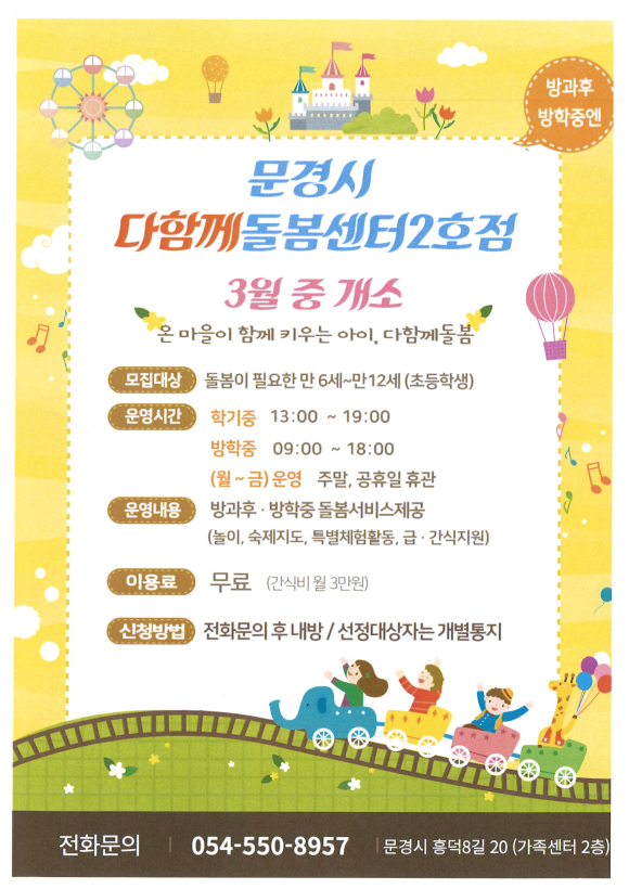이용을 원하는 경우 다함께돌봄센터 2호점(문의처 054-550-8957,임시번호)로 문의 후 내방하여 신청서를 제출하면 된다.
