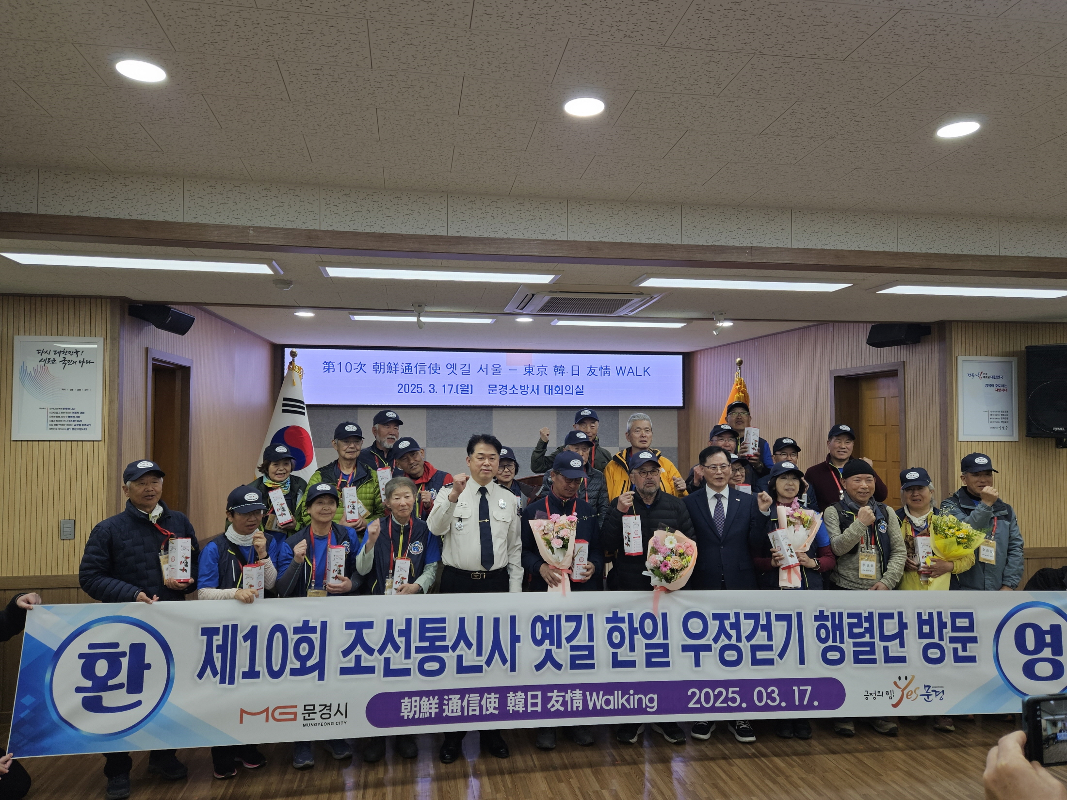문경시는 17일 「제10회 21세기 조선통신사 옛길 한·일 우정걷기」행렬단을 맞아 문경소방서 대회의실에서 기념품 교환 등의 환영행사를 했다.
