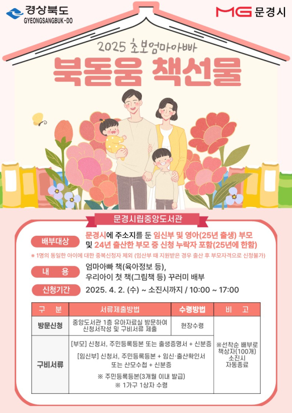 문경시립중앙도서관은 경상북도와 함께 4월 2일부터 ‘저출생과 전쟁 100대 실행 과제’의 일환으로 ‘2025년 초보 엄마아빠 북돋움 책선물 사업’을 시행한다.