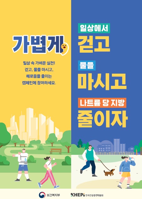 “가볍게! 일상속에서 걷고, 물을 마시고, 나트륨·당·지방 줄이자!” 는 메인 슬로건으로 비만에 대해 일관되고 효과적인 메시지를 전달함으로서 비만예방과 관리를 위한 시민들의 올바른 생활습관 형성에 도움이 기대된다.