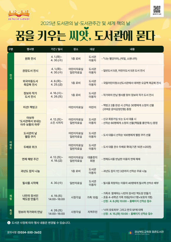 □ 경상북도교육청 점촌도서관(관장 박상선)은 2025년 도서관의 날·도서관주간 및 세계 책의 날을 맞이하여‘꿈을 키우는 씨앗, 도서관에 묻다’라는 주제로 4월 한 달 동안 다양한 독서 문화 행사를 운영한다.