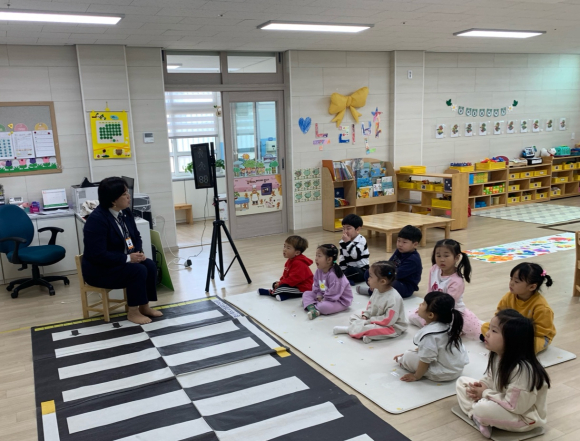 □ 경상북도교통문화연수원 강사 선생님의 이론 수업과 체험학습을 통해 교통안전 습관을 배우는 시간을 가졌다. 교통안전교육 영상을 보며 유아들은 안전하게 길 건너는 법, 자동차에서의 안전 약속, 버스에 혼자 남았을 때 대처하는 법 등을 배웠다. 체험활동에서는 신호등의 신호에 따라 손을 들고 좌우를 살피며 올바르게 횡단보도를 건너는 방법을 익혔다.