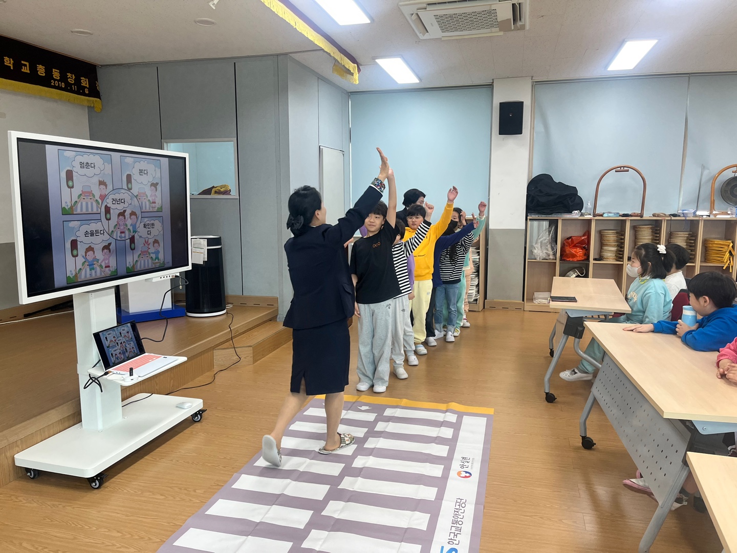 ▣ 특히, 교육 효과를 극대화하기 위해 모형 횡단보도를 설치하여 학생들이 실제 상황처럼 횡단보도를 건너보는 실습 활동도 이루어졌다. 학생들은 스스로 손을 들고 좌우를 살핀 후 안전하게 횡단하는 체험을 통해 올바른 보행 습관을 익혔다.