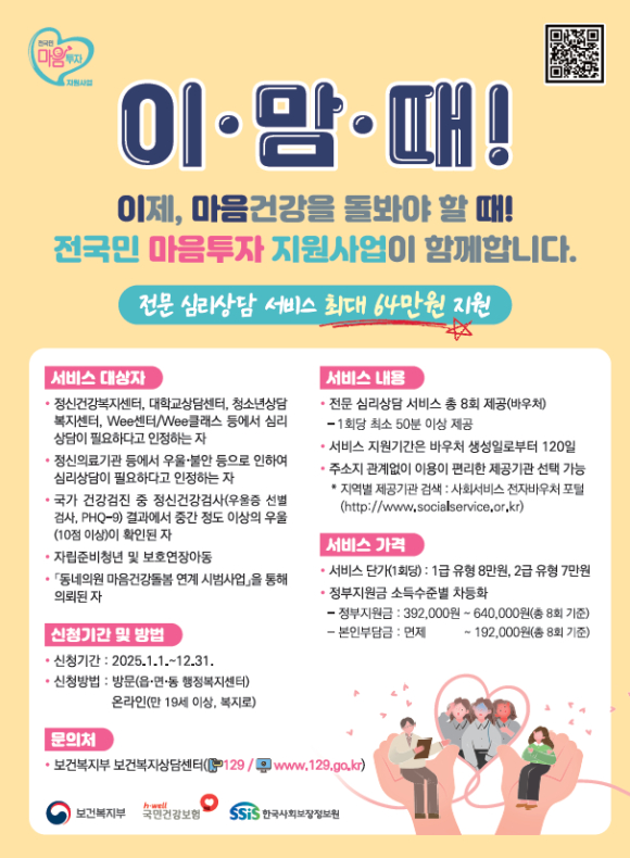 문경시보건소는 우울·불안 등 정서적 어려움을 겪는 시민들을 돕기 위해 '전국민 마음투자 지원사업'이 연중 운영된다고 밝혔다.