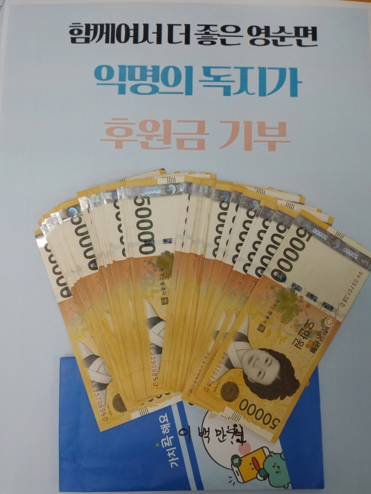 권순구 영순면장은 “이웃을 위해 숨은 나눔을 실천해주시는 기부자님의 선행에 감사드린다”며 "독지가의 바람이 헛되이 않도록 촘촘하게 살펴 잘 처리하겠다”고 감사의 마음을 전했다.