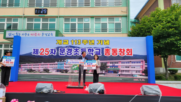 □ 문경초등학교(교장 김은정)는 5월 24일(토) 개교 113주년 기념 제25차 총동창회 체육대회에서 ‘입학 축하 장학금 전달식’을 가졌다.