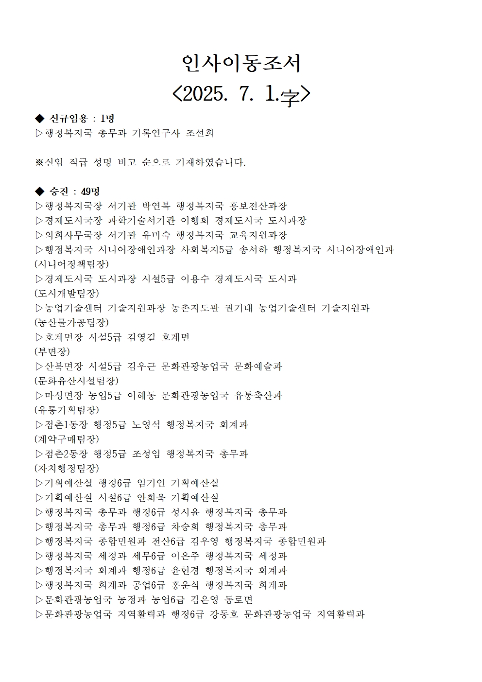문경시 인사이동조서(2025.07.01子)
