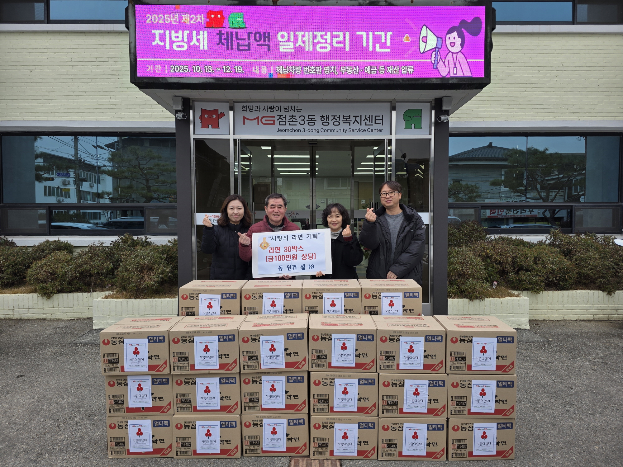 동원건설(주)은 2024년 장학금 100만 원 기탁과 2023년부터 사랑의 라면을 올해까지 총 140박스(500만 원 상당)를 전달했고, 이날 기탁된 물품은 추운 겨울을 보내고 있을 관내 취약계층에 좀 더 따뜻한 연말을 보낼 수 있도록 전달될 계획이다.