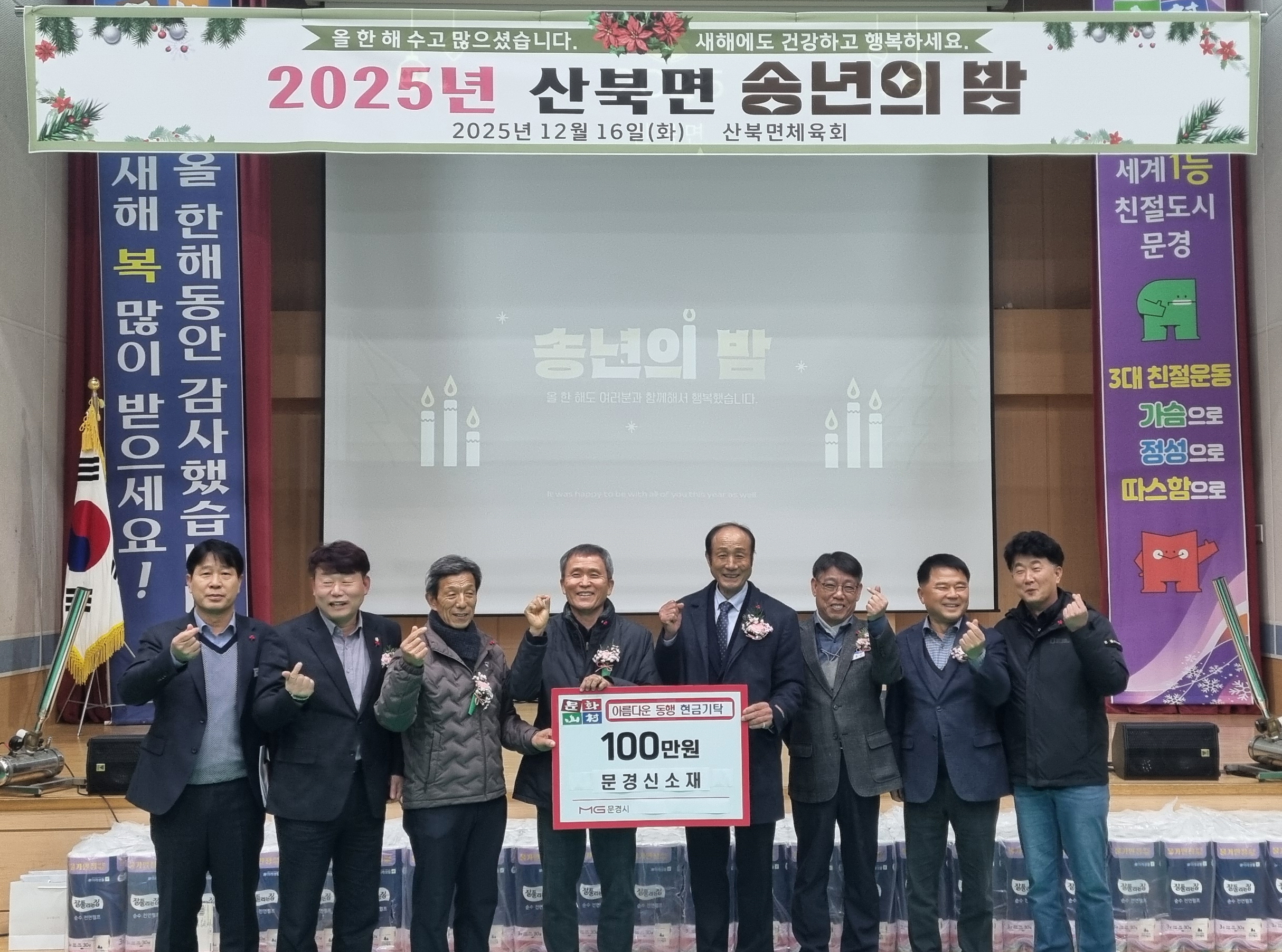 산북면 행정복지센터는 지난 16일 열린 송년의 밤 행사에서 산북면 소재 기업체인 ㈜문경신소재(대표 김대겸)로부터 아름다운 동행 후원금 100만 원을, 바르게살기운동 산북면위원회(위원장 서홍도)에서 성금 70만 원을 각각 기탁받았다.