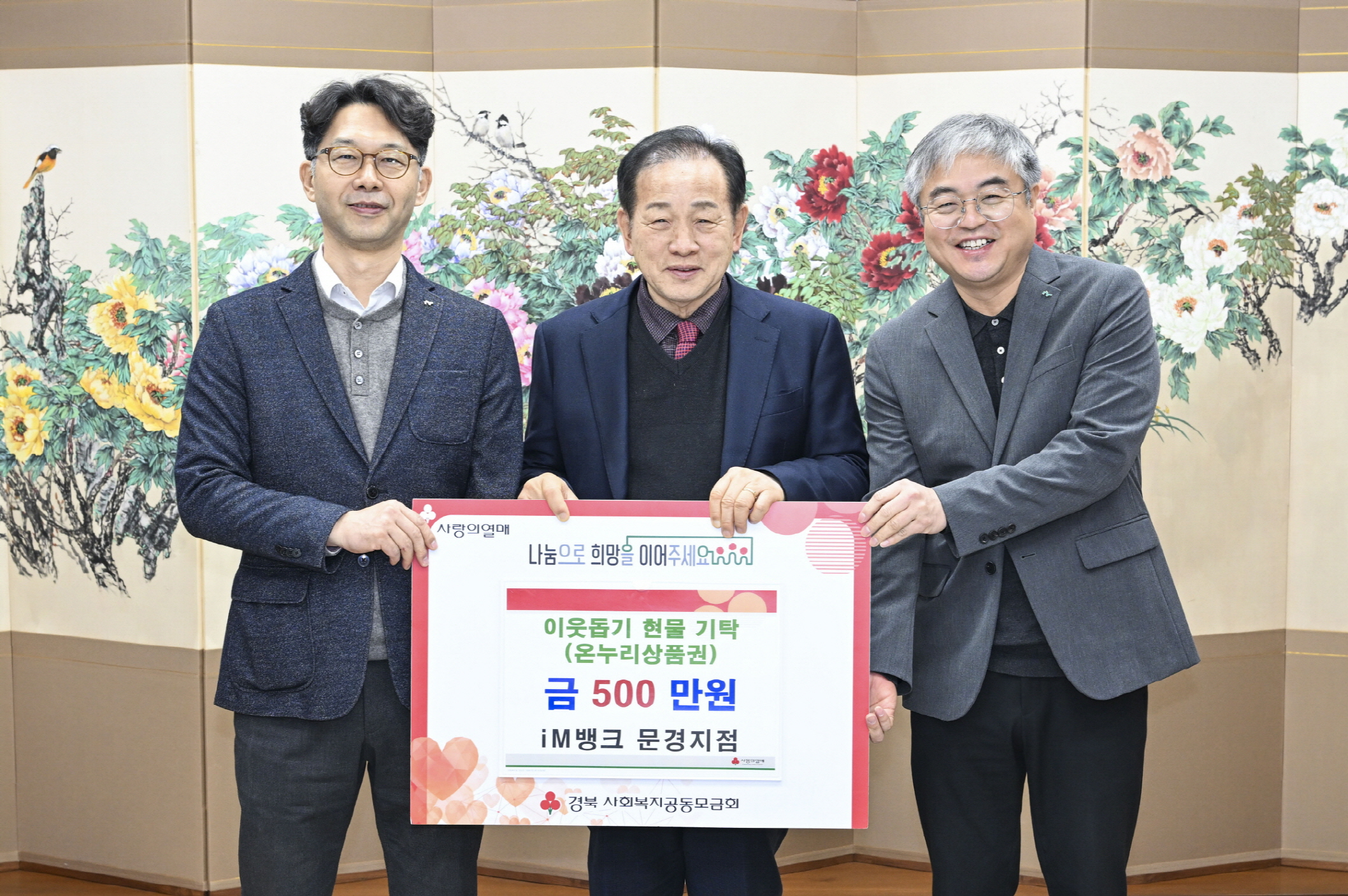 지난 5일 iM뱅크 문경지점(지점장 이영우)은 지역사회 나눔 실천을 위해 문경시에 온누리상품권 500만 원을 기탁했다.