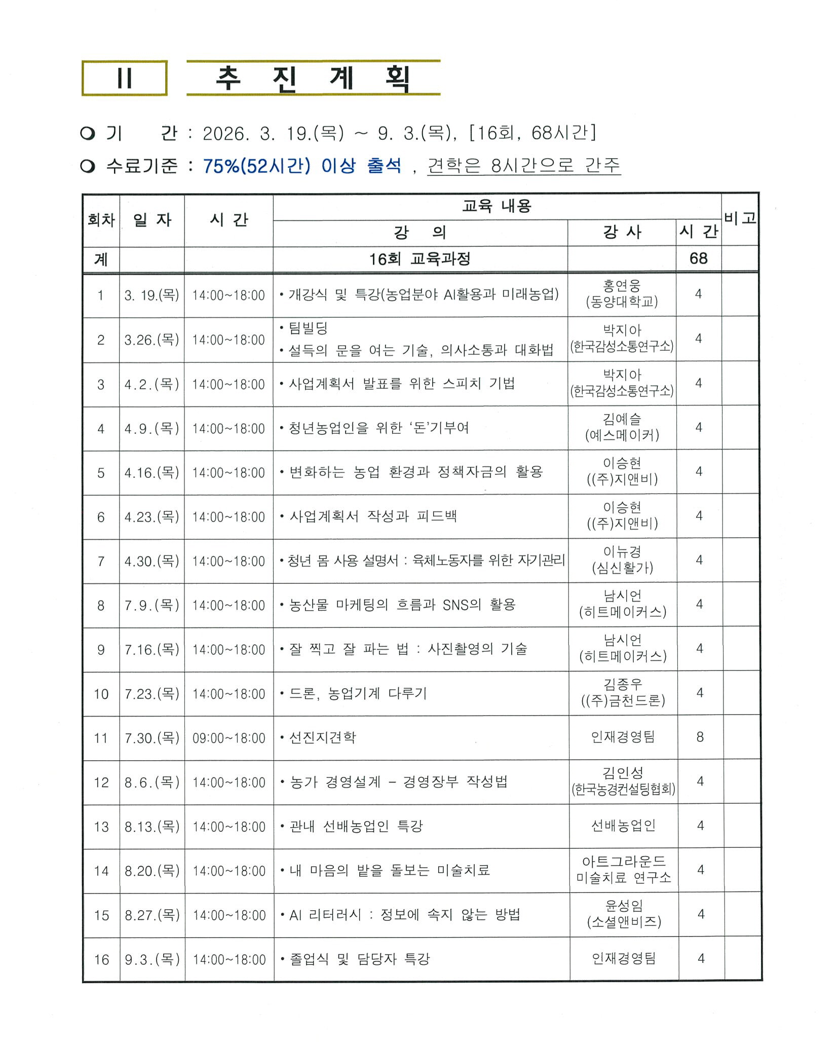 이번 청년농업인과정은 3월 19일 개강식을 시작으로 9월 3일까지 총 16회에 걸쳐 운영될 예정이며 특히 변화하는 농업 환경에 발맞추어 청년농업인들이 현장에서 필요로 하는 실질적인 지식과 기술을 전달하고 농촌의 안정적인 정착을 도모할 수 있는 다양한 프로그램이 마련되어 기대를 모으고 있다.