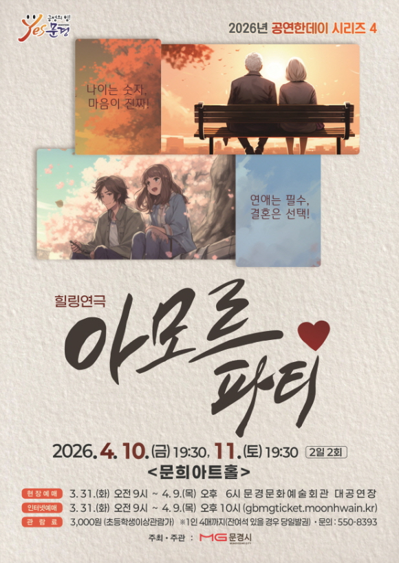문경문화예술회관에서는 누구나 한번쯤 겪는 순수한 사랑 이야기를 담은 연극 아모르파티 공연을 4월 10일(금) 19:30, 11(토) 19:30 (2일 2회)에 문희아트홀에서 개최한다.