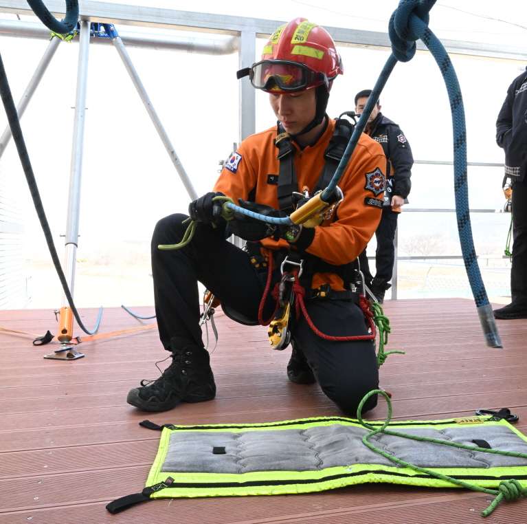 이번 평가는 각 분야별 필수 항목으로 진행되었다. 화재 분야는 고립 상황 속 신속 탈출을 위한‘호스 읽기’를, 구조는 고층 인명구조를 위한‘로프 하강 및 등반’을 중점 점검했다. 구급에서는‘기관 내 삽관’을 비롯해‘영아 기도 폐쇄 및 영아 기본소생술’등 전문성이 요구되는 응급처치 능력을 엄격히 평가하며 실전 대응력을 높였다.
