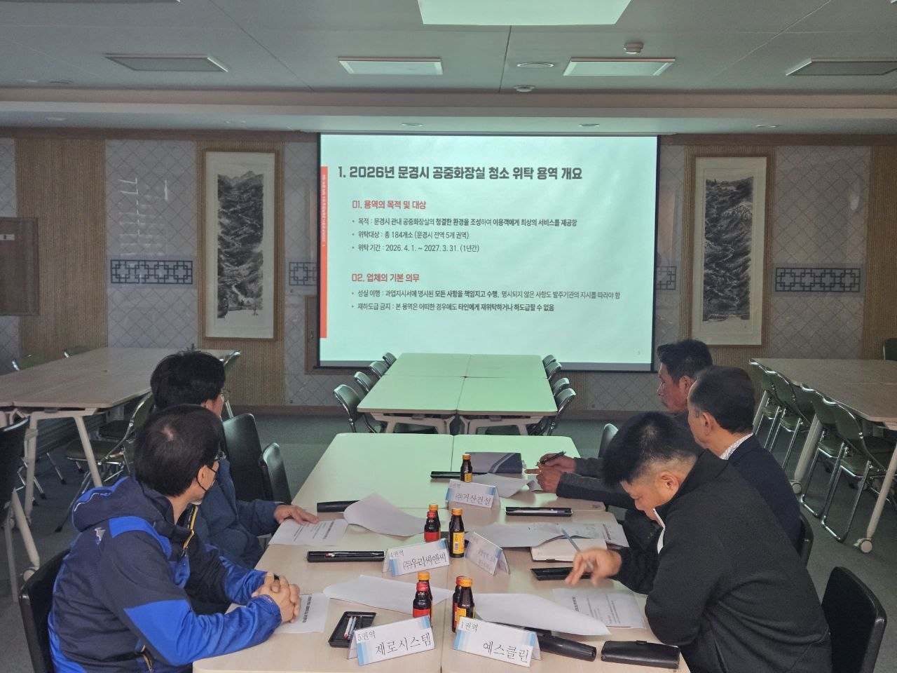 이번 교육은 2026년 4월 1일부터 2027년 3월 31일까지 1년간 진행되는 공중화장실 청소 위탁사업의 원활한 수행을 위해 마련되었으며, 문경시 전역 5개 권역을 관리하는 위탁업체 관계자들이 참석했다.